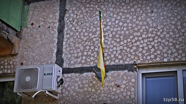 Такая картина, подпадающая по всем признакам под вышеуказанную статью, образовалась на углу дома 140 по проспекту Победы после ухода оттуда "незаменимых специалистов" из ближнего зарубежья, которые выполняли там работы по утеплению стен здания. Флаги, судя по всему, мешали заколачивать деньги, и их, флаги эти, завязали таким вот образом…