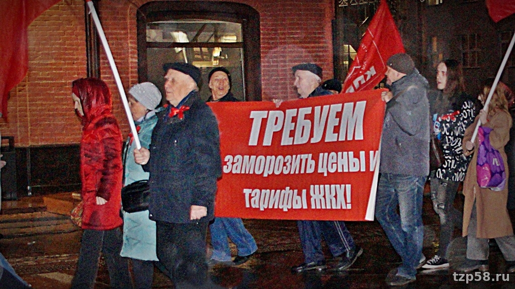 Согласно анонсу, распространённому обкомом пензенских зюгановцев, на этот раз свою топотню с кумачами они посвятили не только очередной годовщине октябрьского переворота 1917 года. Зюгановцы также решили прошвырнуться по улице Московской ещё и за национализацию, понимаете ли, ключевых стратегических отраслей промышленности, природных ресурсов и системы ЖКХ, за свободный, значит, интернет, а ещё против повышения цен на бензин, тарифов ЖКХ, НДС и утильсбора.