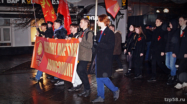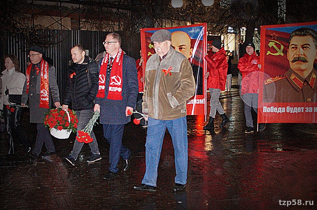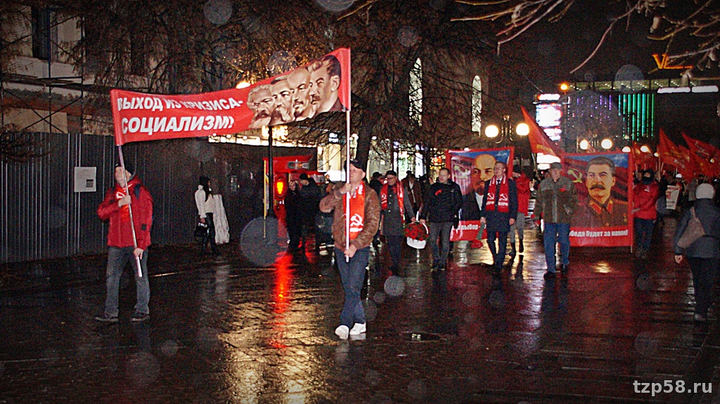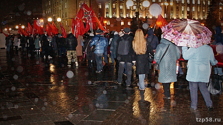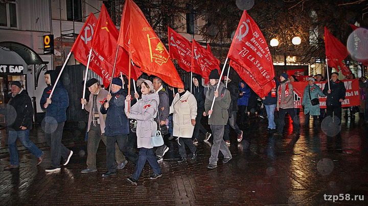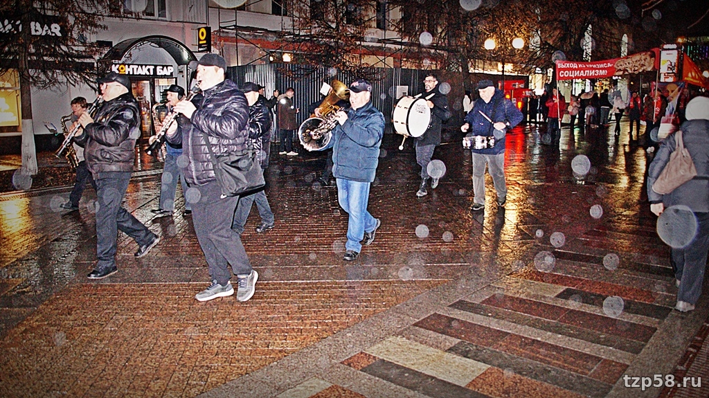 Во мраке промозглого осеннего вечера в Пензе 7-го ноября снова, как и ранее, имело место характерное для этой даты зрелище – местные оппортунисты-зюгановцы, выдающие себя за коммунистов, вновь прошлись с кумачами по улице Московской со скоростью похоронной процессии, тем самым отметив очередную годовщину со дня октябрьского переворота 1917 года. По обыкновению стартовали от торгового центра "Арбат", а финишировали менее чем в семистах метрах у драмтеатра, где на митинге истерично покричали лозунги революционной тематики вкупе с кое-какими восклицаниями по текущим событиям как мирового, так и местного характера. Публика была всё та же, как и в прошлые годы – руководящий партактив, престарелые ортодоксы, ностальгирующие по талонам на сахар и колбасу за 2-20, да с десяток комсомол-зюгановцев. А ещё некие "лево-патриотические силы" – всякая ошивающаяся при обкоме зюгановцев малозначащая мелочь, типа Левого Фронта.